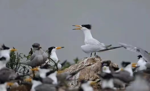 (“神话之鸟”——中华凤头燕鸥(中间2只)与大凤头燕鸥。图来自浙江自然博物院中华凤头燕鸥研究团队)