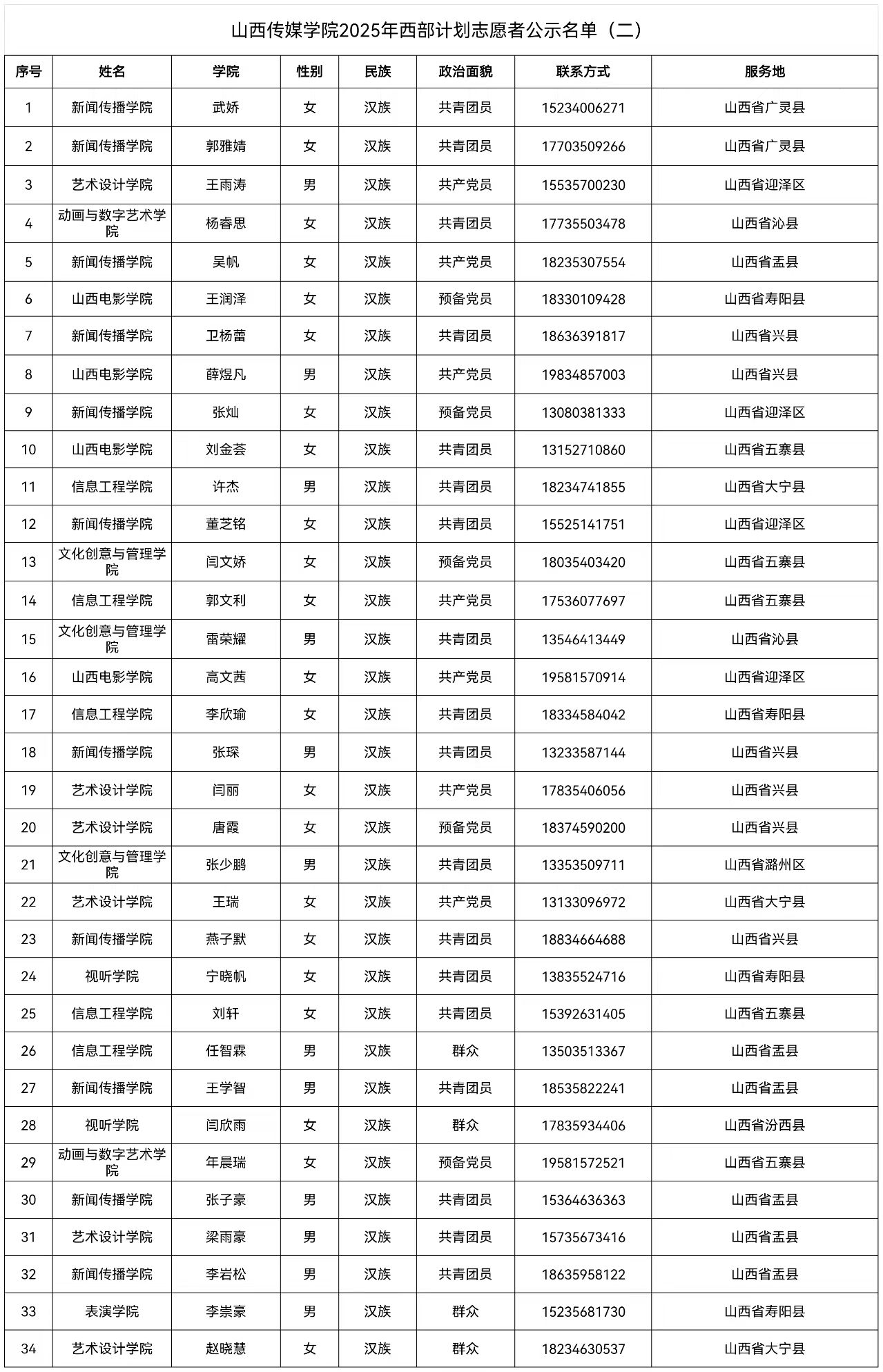 根据山西省西部计划项目办的相关要求,按照公正、公平、公开、择优原则,我校进行了西部计划志愿者的招募与选拔工作,经公开招募、自愿报名、资格审核、笔试、面试、岗位对接、体检等环节,目前选出34名山西西部计划地方项目志愿者。现将具体名单公示如下: